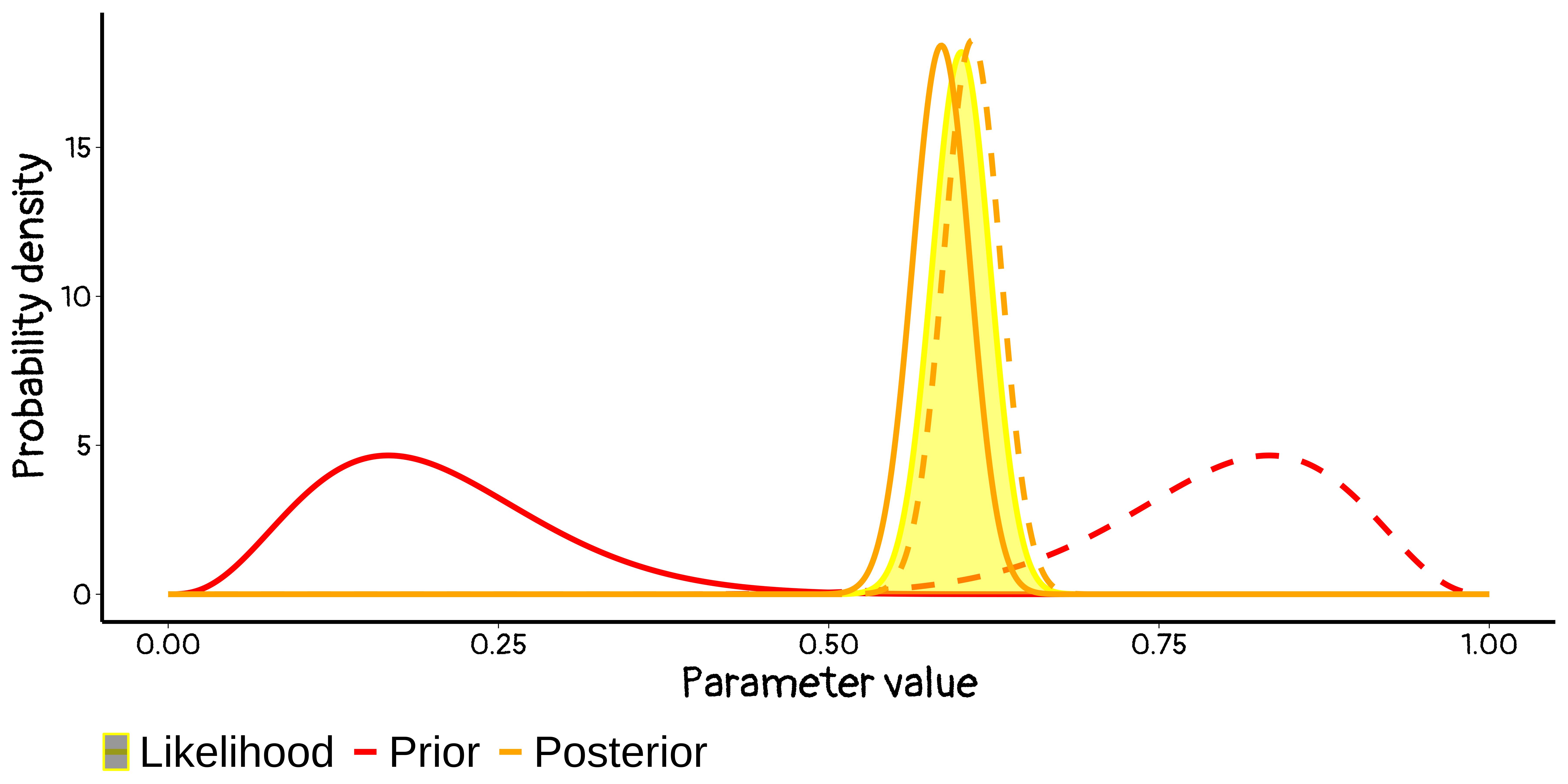 \[ \begin{align} P_{post}(β|Y) &∝ f(Y|β) × P_{prior}(β)\\ \text{Posterior} &∝ \text{Likelihood} × \text{Prior} \end{align} \]