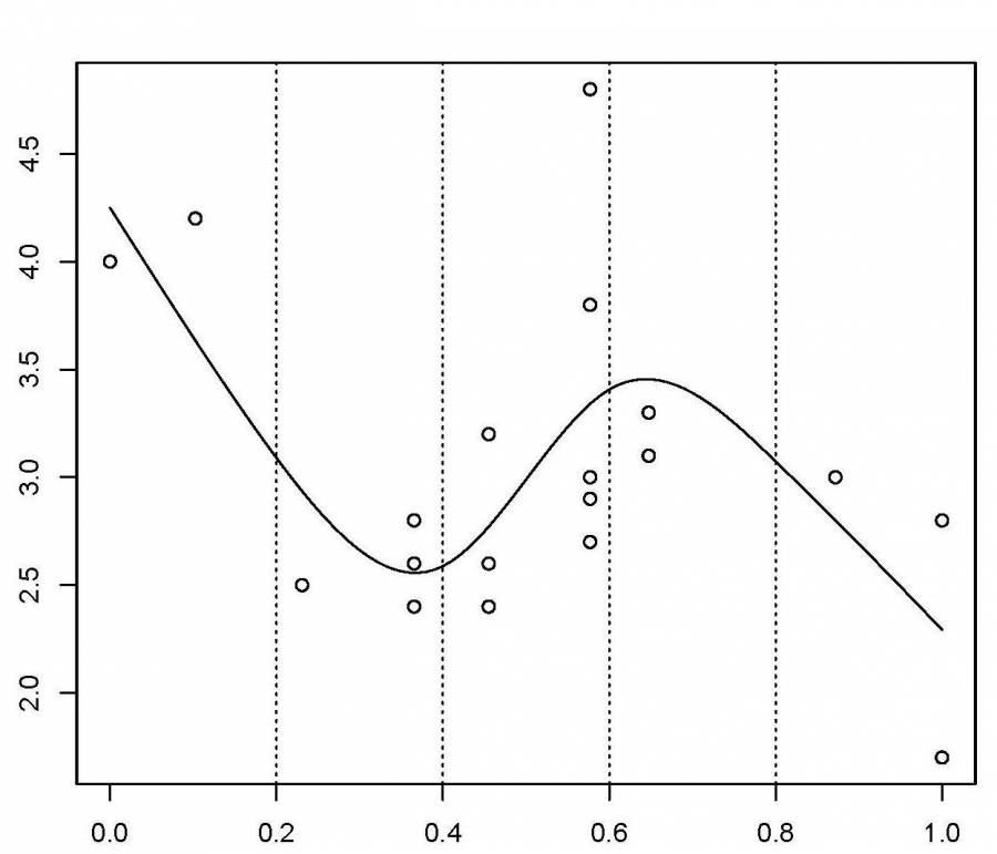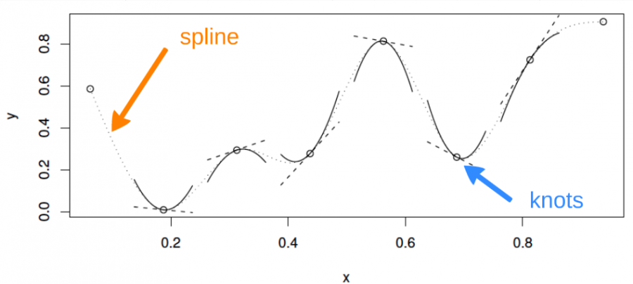 Here, the knots are evenly spaced through the range of observed x values. However, the choice of the degree of model smoothness is controlled by the the number of knots, which was arbitrary.