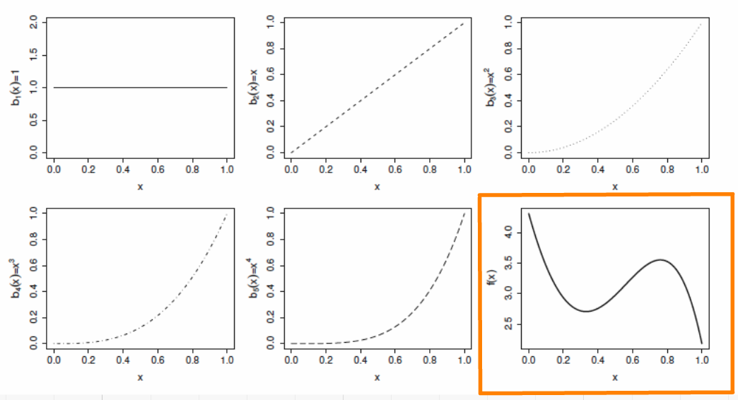 The basis functions are each multiplied by a real valued parameter, \(\beta_j\), and are then summed to give the final curve \(f(x)\). Here is an example of a polynomial basis of order 4.