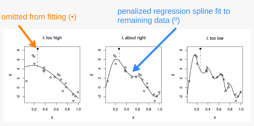 If \(\lambda\) is too high then the data will be over smoothed, and if it is too low then the data will be under smoothed.