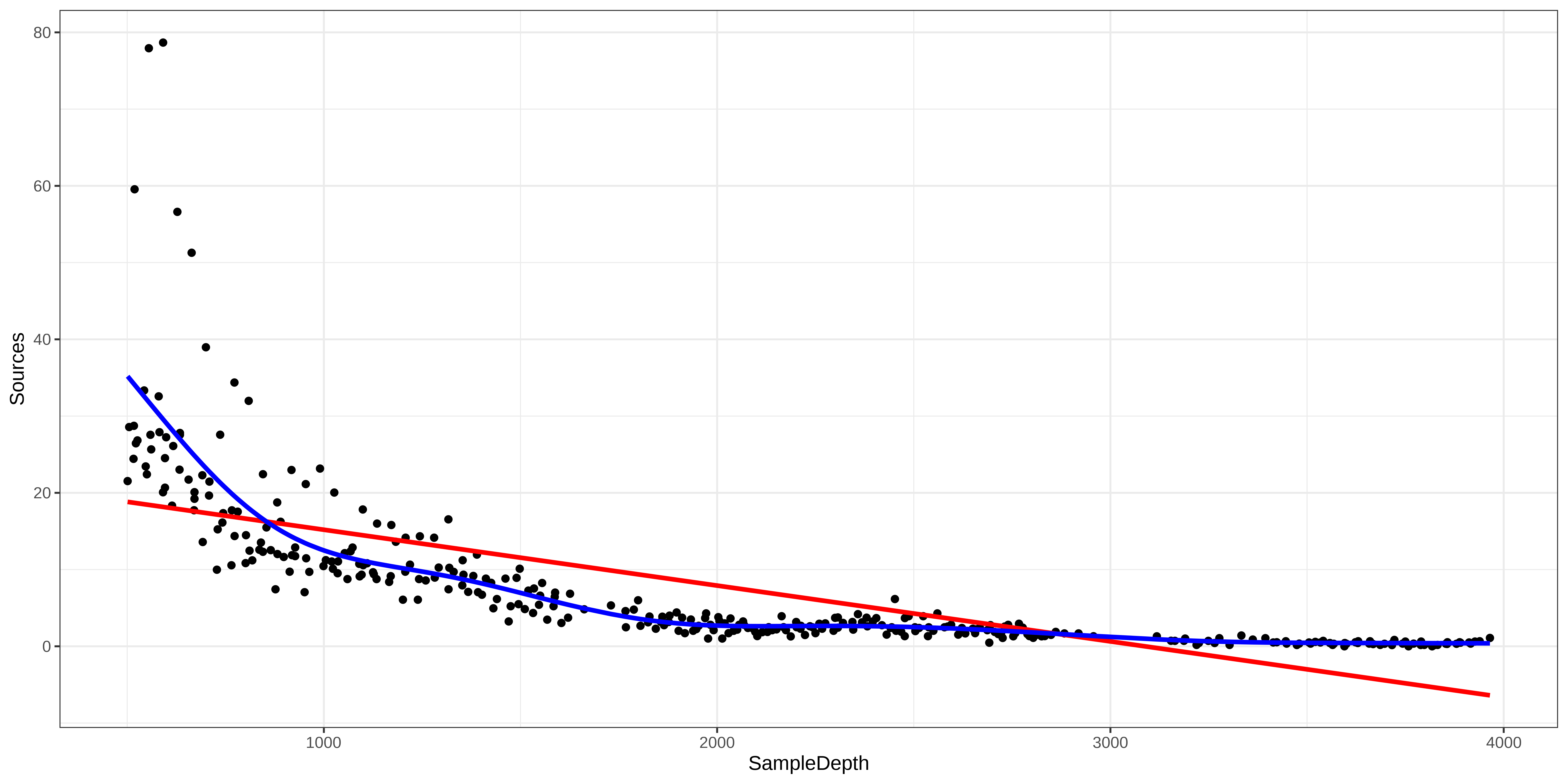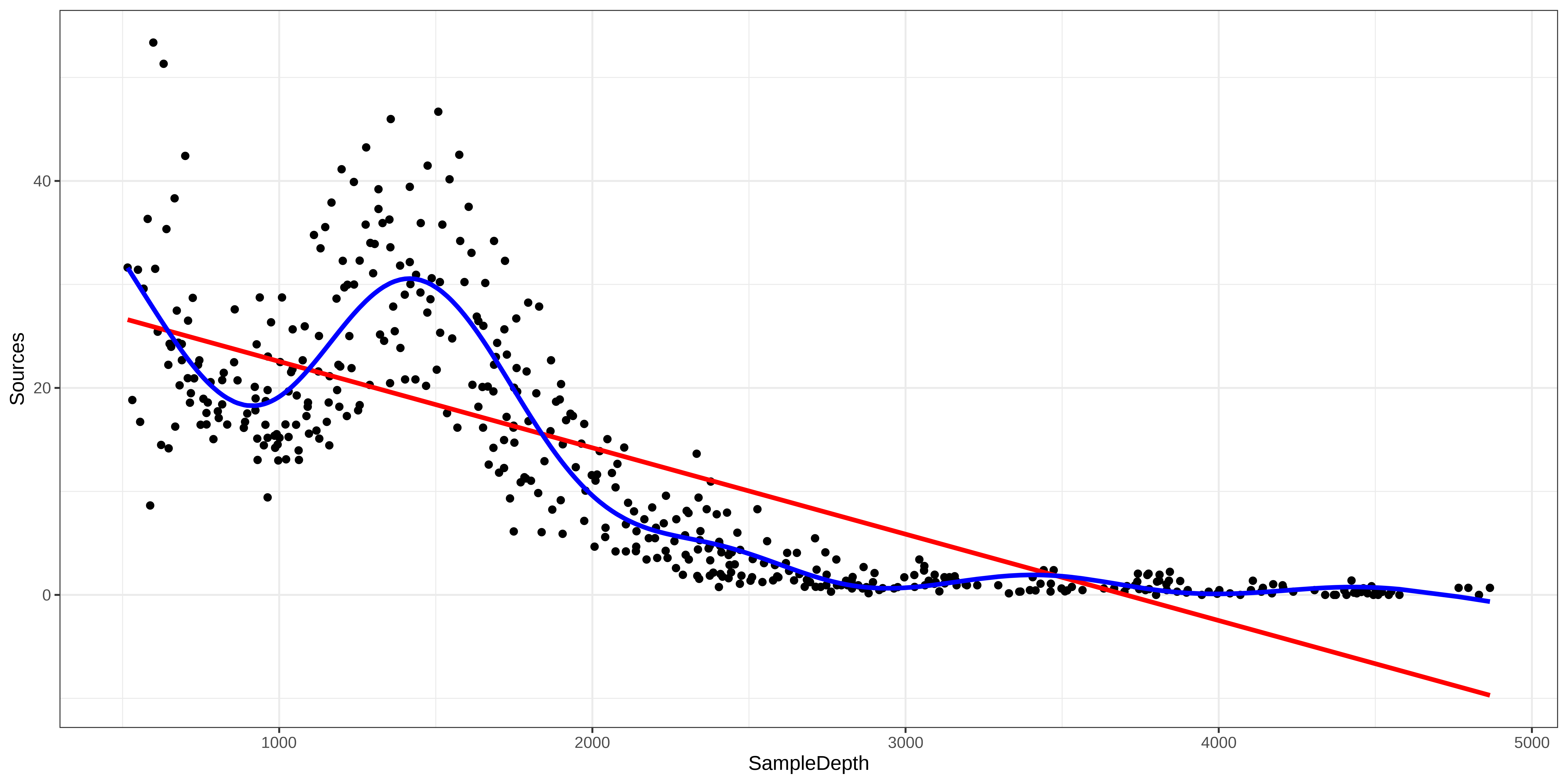 Let’s begin by trying to fit a linear regression model to the relationship between Sources and SampleDepth.