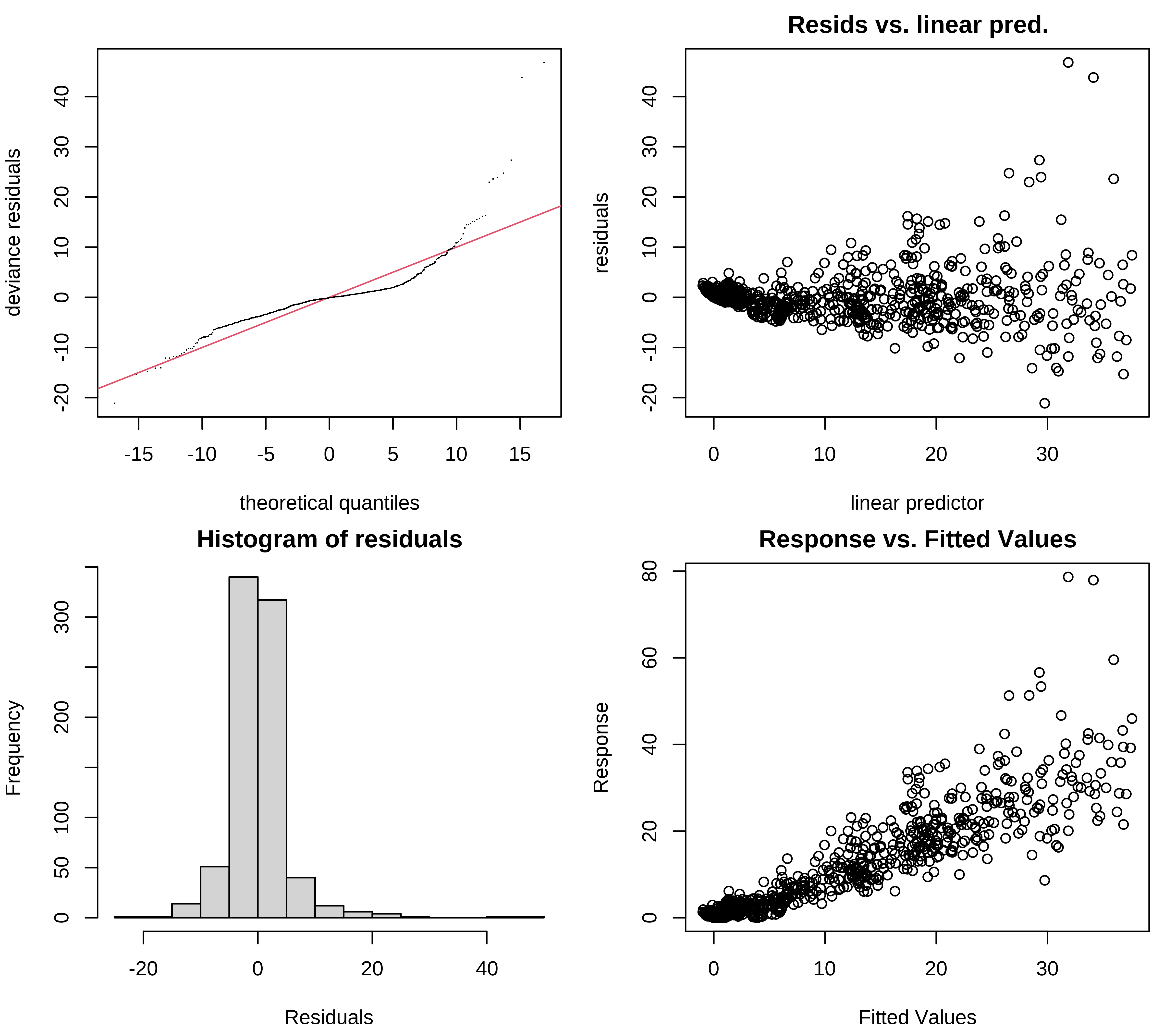 We should also verify the residual plots, to validate the Tweedie distribution: