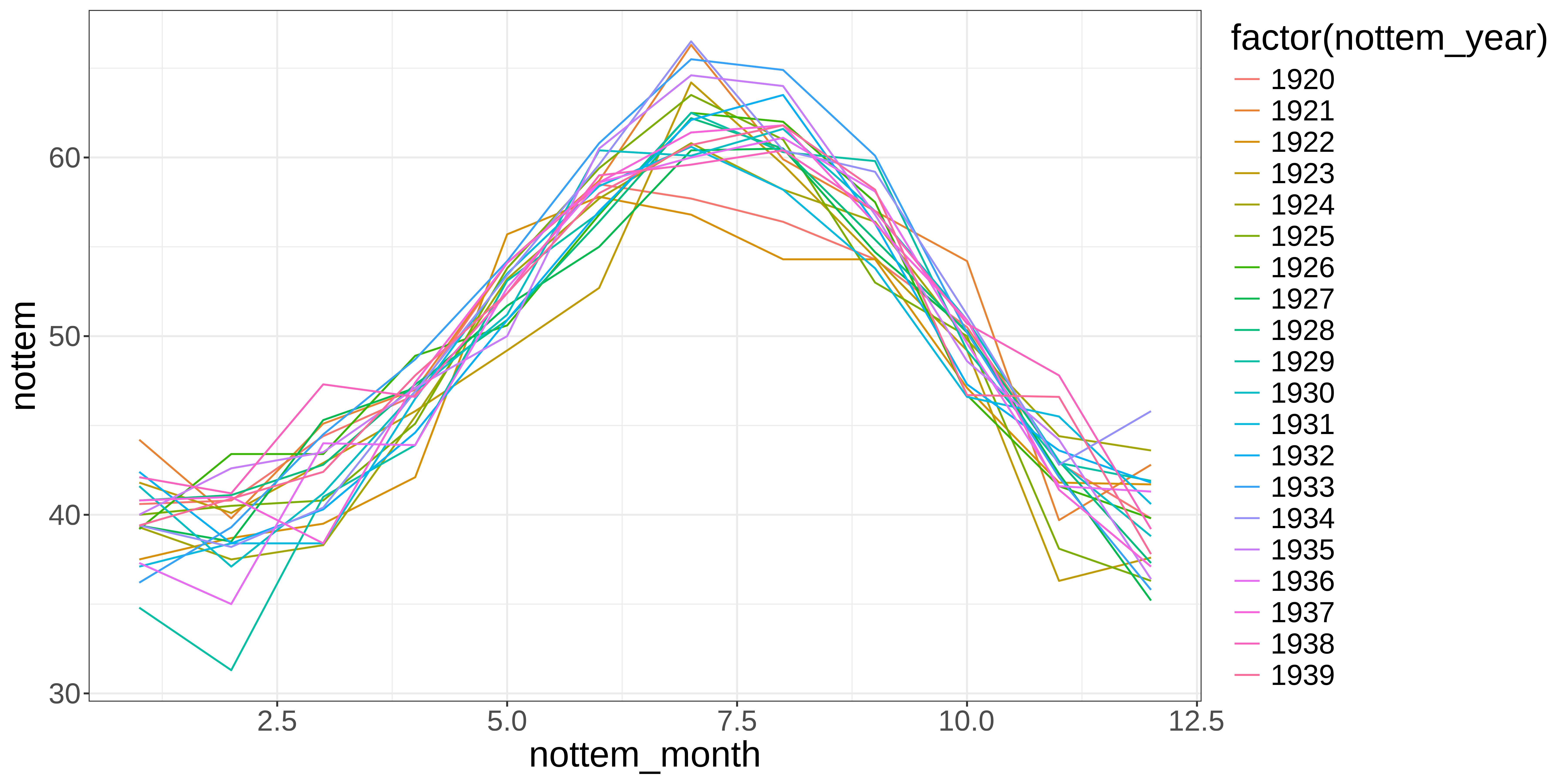 Let’s plot the monthly temperature fluctuations for every year in the nottem dataset: