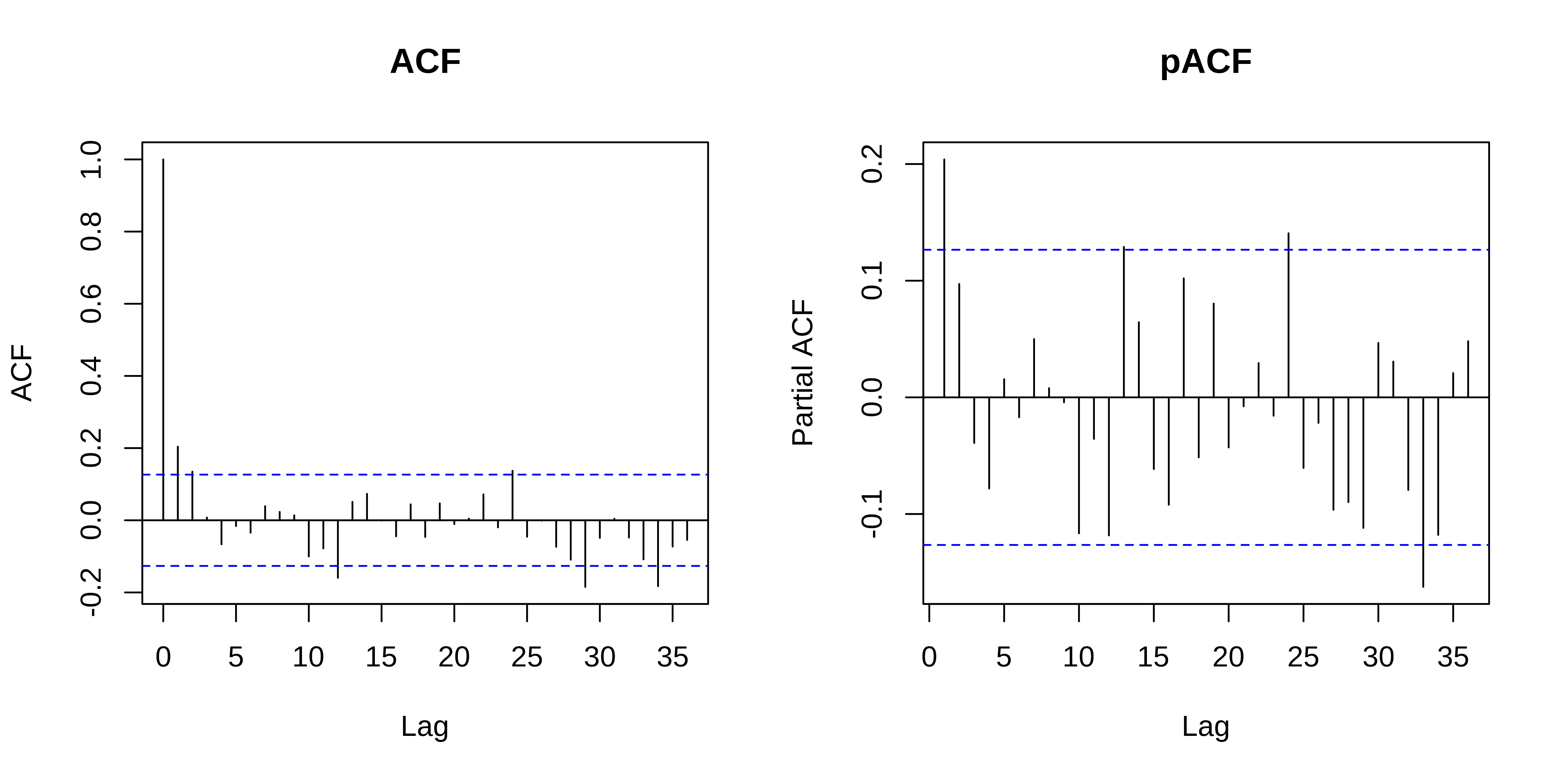 ACF evaluates the cross correlation and pACF the partial correlation of a time series with itself at different time lags (i.e. similarity between observations at increasingly large time lags).