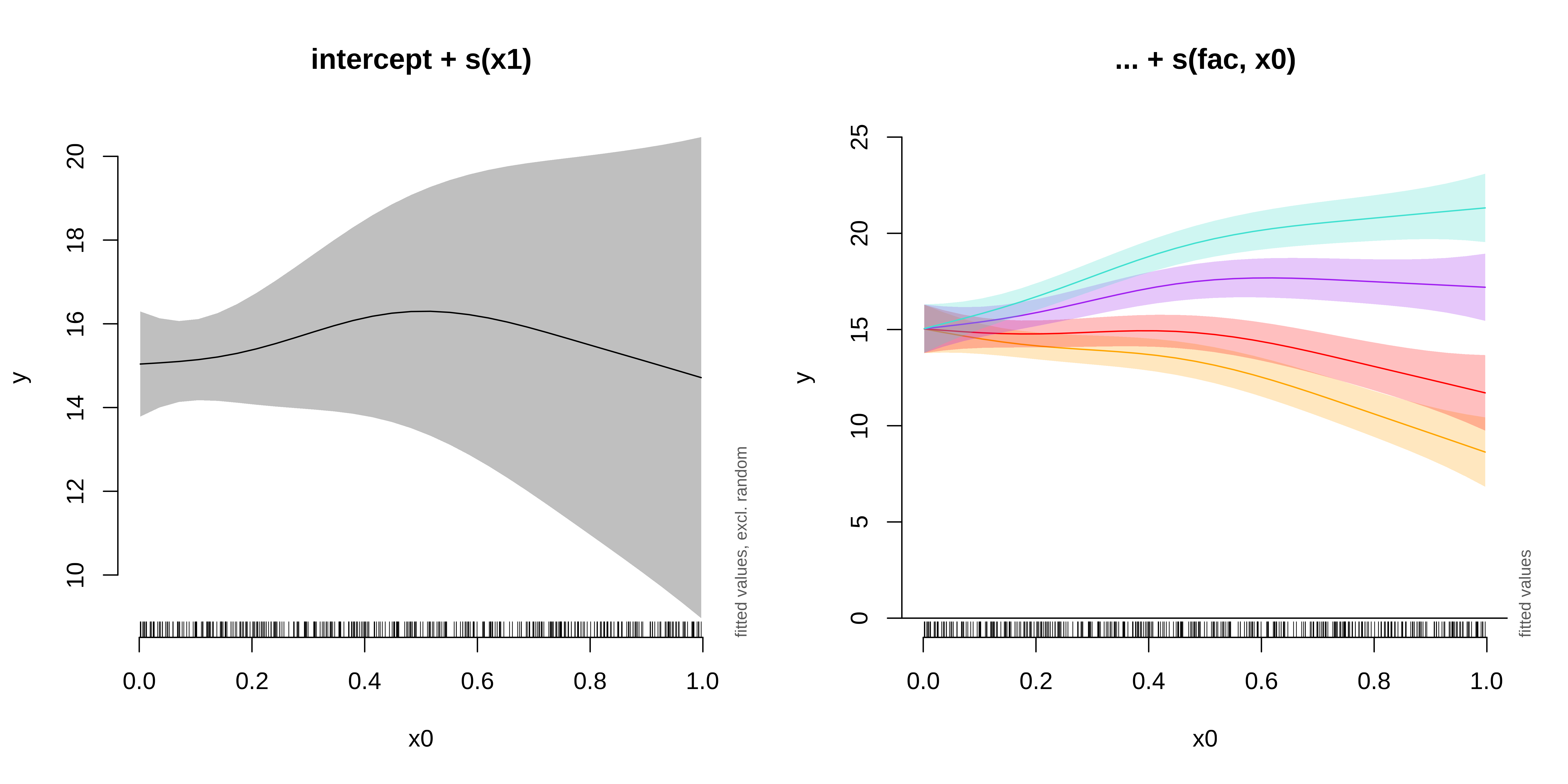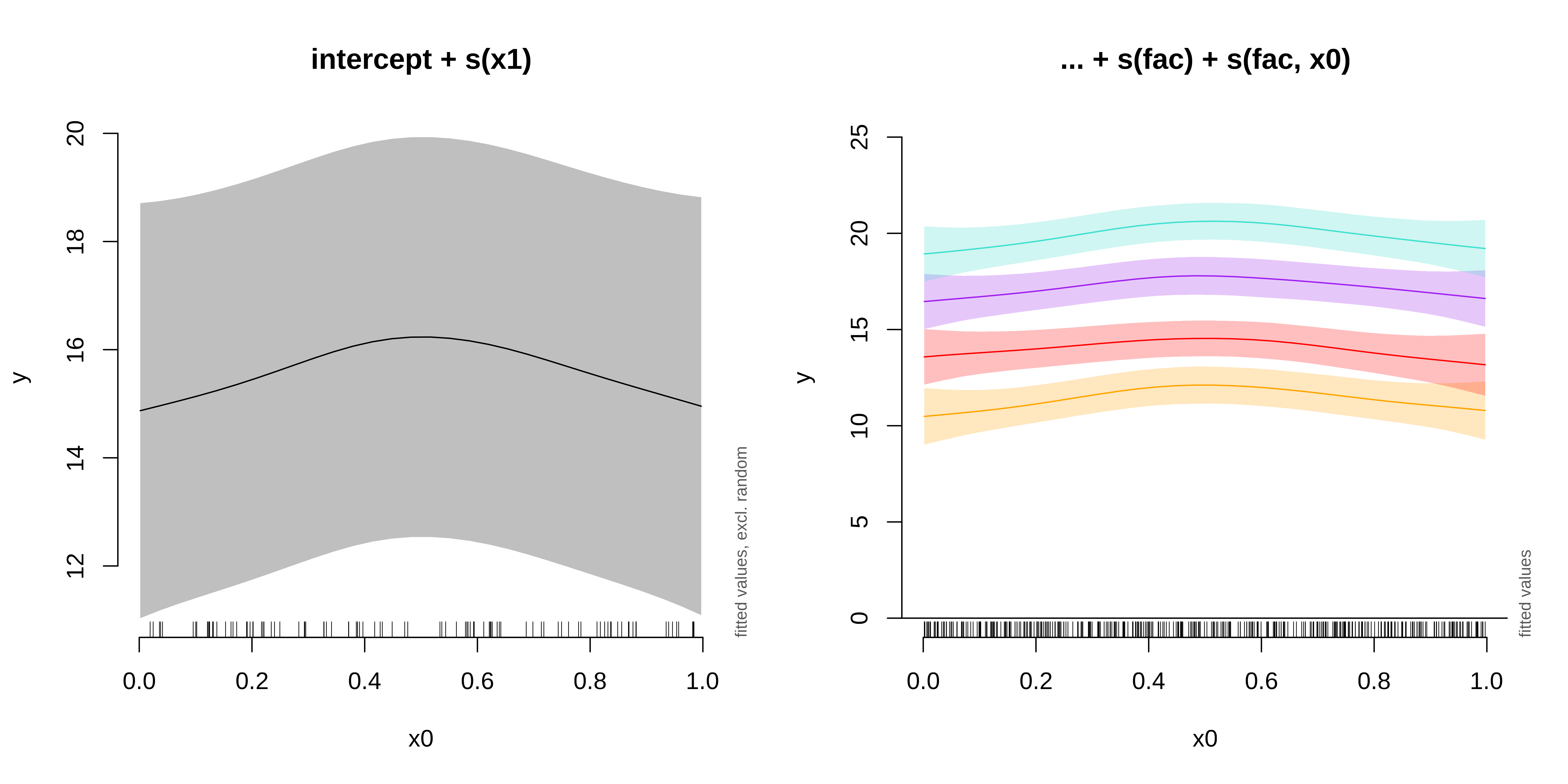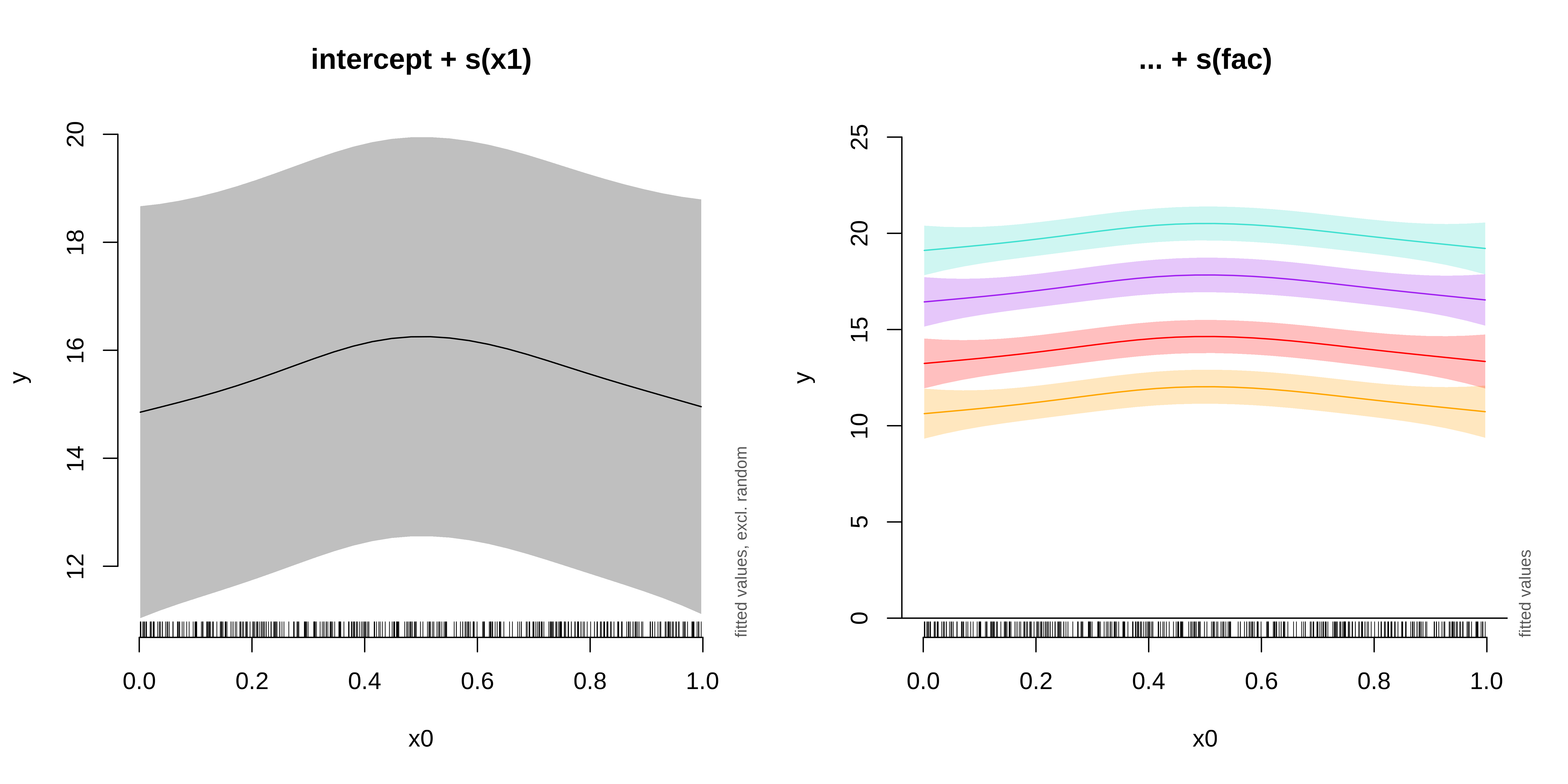 s(fac, bs = "re")s(fac, x0, bs = "re")s(x0, fac, bs = "fs", m = 1), where the argument m=1 sets a heavier penalty for the smooth moving away from 0, causing shrinkage to the mean.We will use the gamSim() function to generate a dataset with a random effect, then run a model with a random intercept using fac as the random factor.